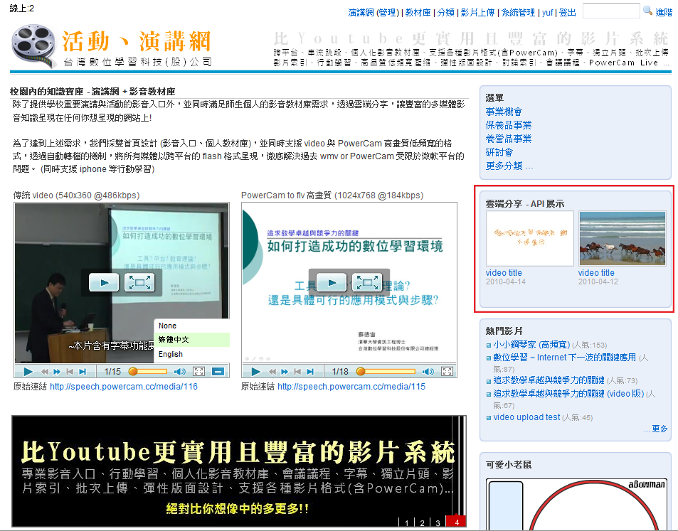 iMOD 採雙首頁設計,演講網與教材庫皆可很彈性的安排首頁內容,包含: 選單、版面配置以及樣式,以演講網為例說明如下: