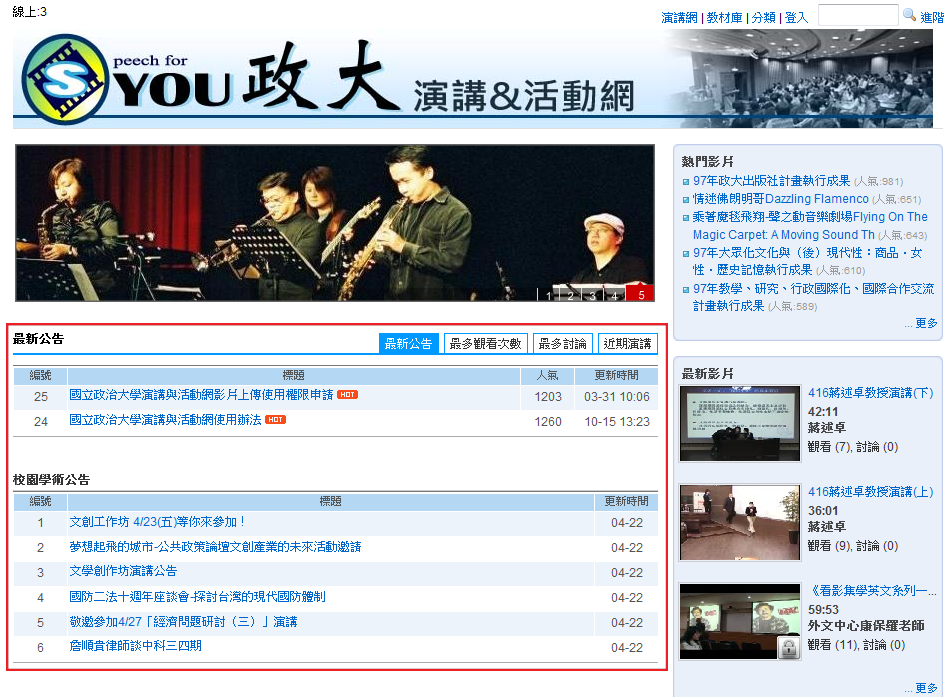 以分頁的方式安排資訊,每個分頁都可以加入想放置的資訊,如: 訂閱 RSS、公告、近期演講、最新研討會、熱門影片、最多討論影片等 (範例)。新增步驟如下: