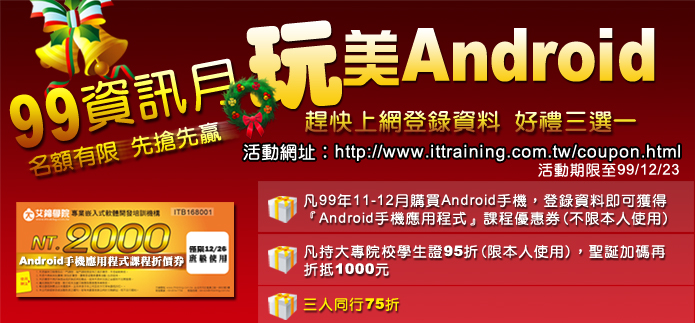 好禮一:凡99年11~12月購買Android手機,登錄資料即可取得『Android手機應用程式設計』課程優惠券