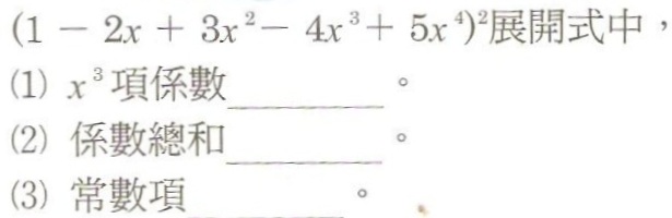 (2)求係數總和有一個秘訣,就是設x=1,結果是 (1-2+3-4+5)(1-2+3-4+5) ,你去算算看囉