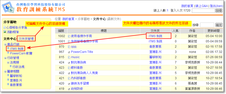 "文件夾" 欄位顯示的名稱即為該份文件所上傳的目錄位置 (如附件)